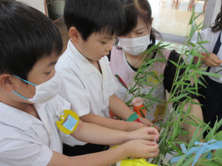 7月6日、七夕に向けて笹に飾り付けを行いました。