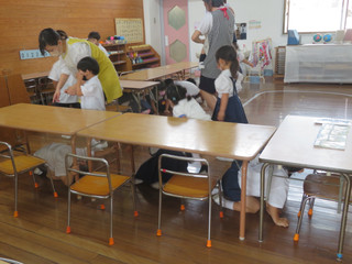 あわてないで机の下に避難します。